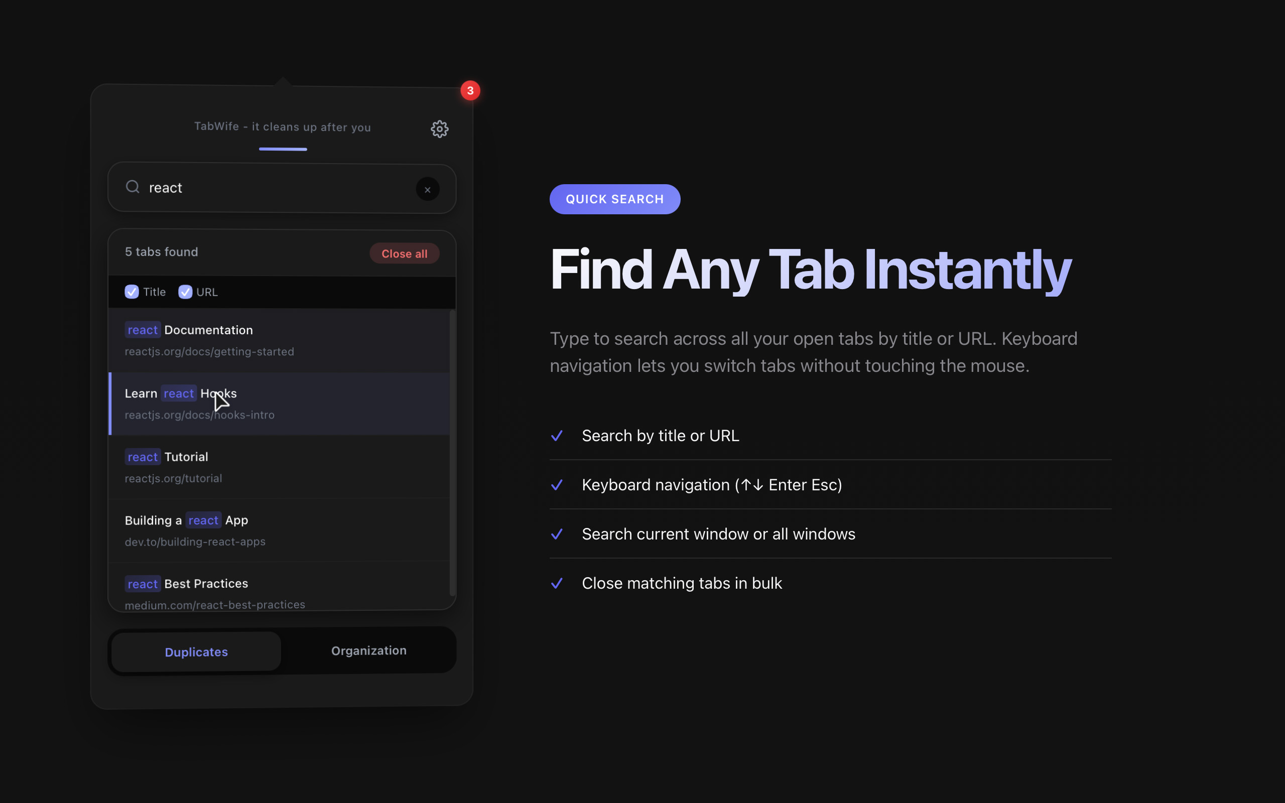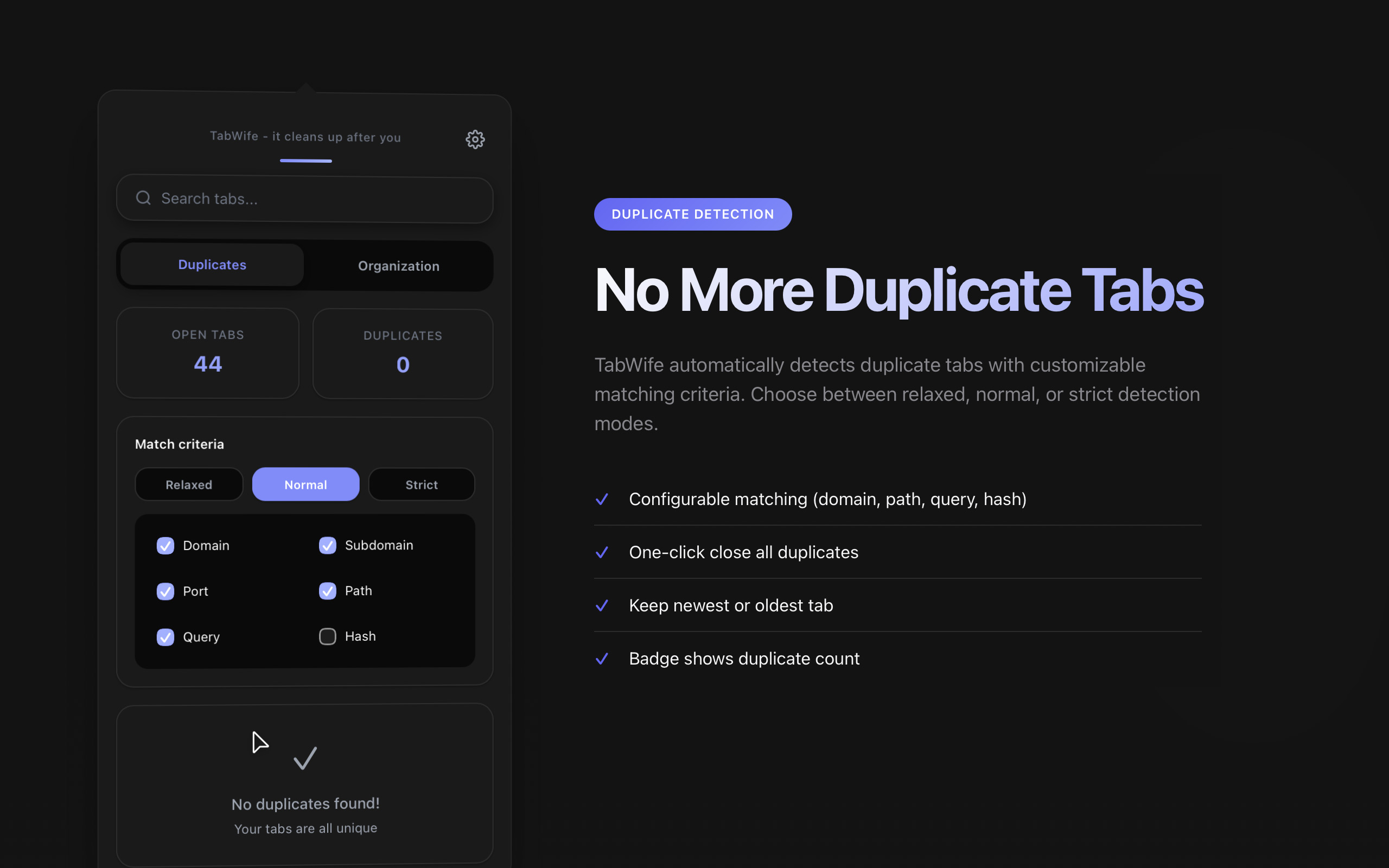 Find and close duplicate tabs instantly. Customize matching criteria from relaxed to strict.