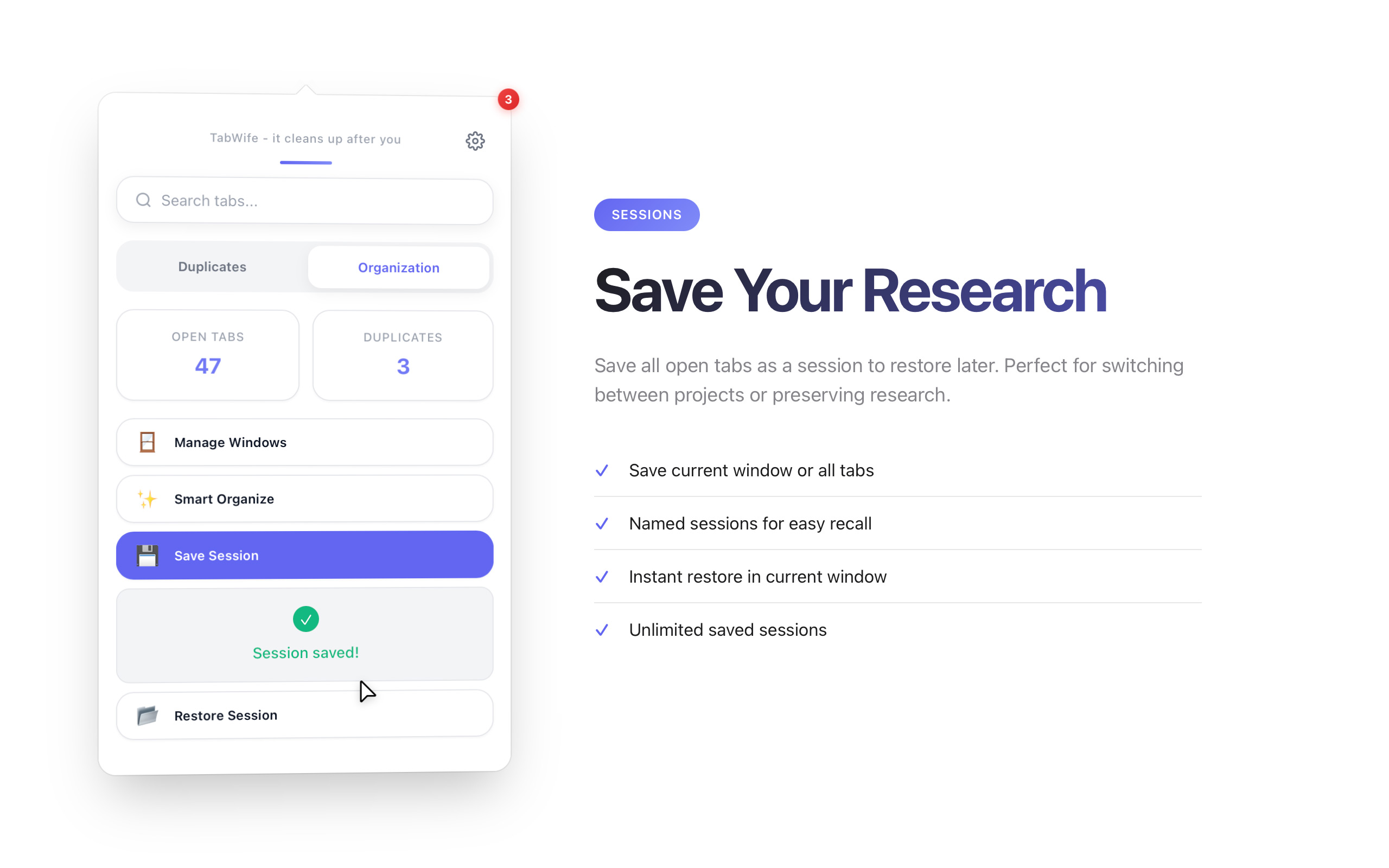 Save your current tabs as a session and restore them anytime. Never lose your research again.